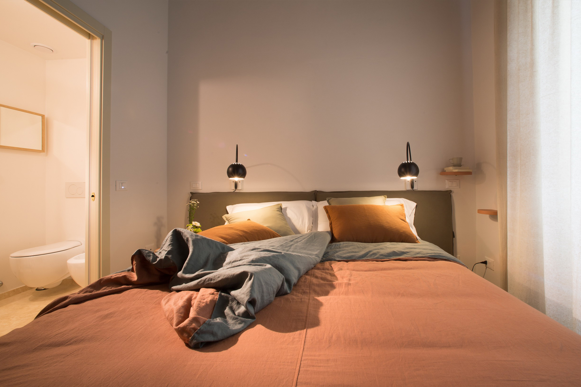 An early twentieth century apartment, a short walk from the center of Florence, has became a bed and breakfast that houses five rooms with bathroom, breakfast room and reception. The restyling operation was conducted with the aim of achieving a quality according to the economic requirements placed by the customer. The designer’s strategy, thus, has been to focus attention on some elements of value and then fade towards equally original solutions in order to respect those clients’ constraints. The precious travertine for the bathrooms (also used in single blocks), the wallpaper designed by Fornasetti and built with the traditional techniques from Cole and Son and the Inga Sempé “Vapeur” lamps coexist with wardrobes and desks made by plasterboard. The choice of colours, then, creates an enveloping atmosphere and helps to visually integrate plasterboard furniture in the room space. The same colour attention is given to the combination of fabrics and upholstery, according to a care in every detail.